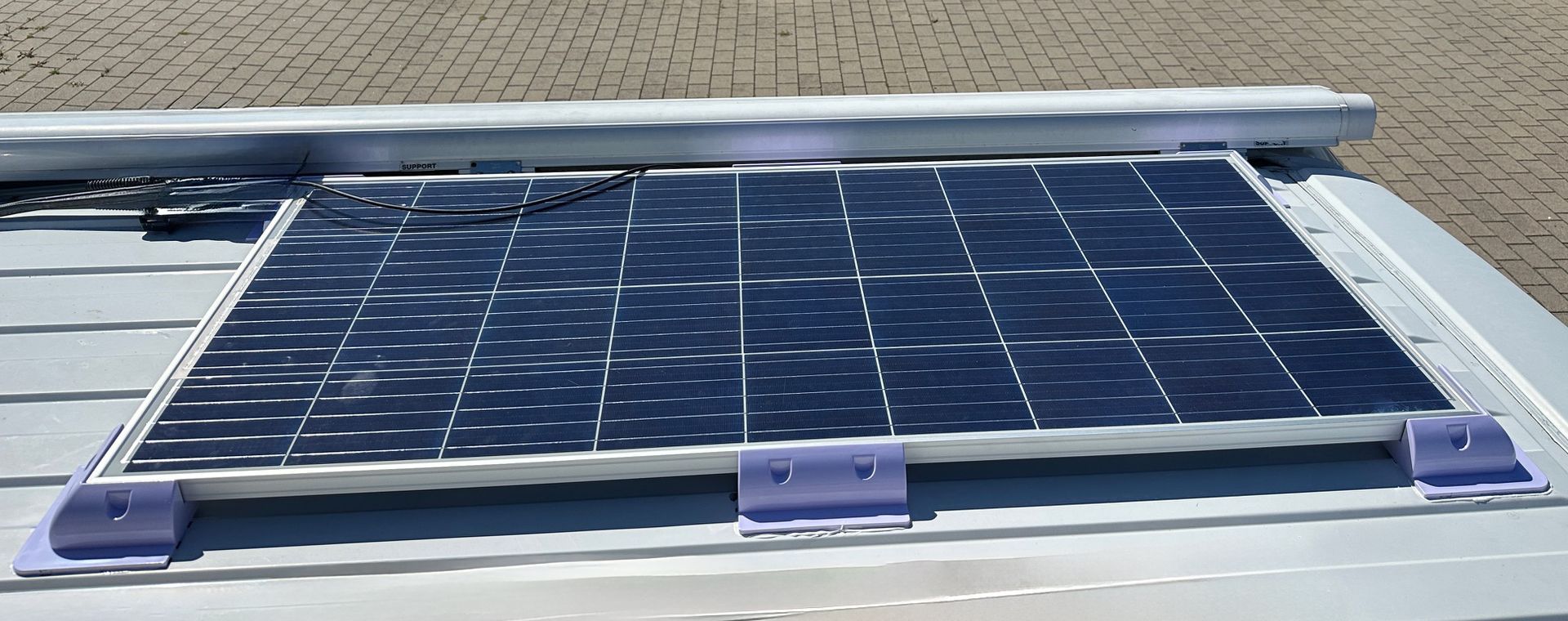 Installation von PV-Modulen auf dem Dach, Leitungsführung in den Innenraum, Anschluss des Ladereglers direkt an die Bordbatterie oder an den E-Block, Austausch der Bleibatterien durch Lithiumbatterien. Dadurch Gewichtsersparnis und wesentlich höhere nutzbare Kapazität. Die Lithiumbatterien können per App überwacht werden.